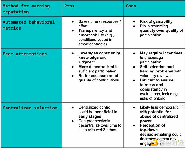 由于声誉系统不是简单地在公开市场上购买的,因此设计如何赚取声誉奖励的空间很大。下表总结了生态系统参与者获得声誉的不同方式的优缺点: