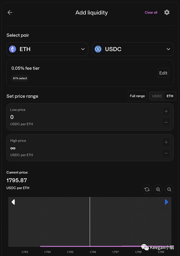 其中,最核心的改动就是引入了集中流动性机制。所谓集中流动性,主要是说流动性提供者(LP)可以将其提供的流动性”限制“在任意价格区间内来”集中“其流动性。从直观上来说,UniswapV3 中,用户添加流动性的时候,需要设置一个价格区间,如下图所示: