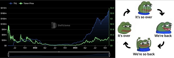 选择有潜力赛道、设计合适的曲线、探索出处于风口的资产,Pendle 的 TVL 与 Volume 一直在增长,尤其今年我们处于加密熊市,这点就更难得: