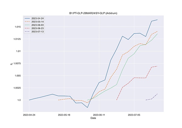 因 PT 的特点 —— 价格与底层资产之间有相关性,在底层资产价格一定的负溢价区间内波动。PT 在 Maturity 后价格与底层资产相等,所以为 PT-SY 提供流动性的无常损失较小。Pendle 团队在推特发布过一些流动池的 IL 回测:在最差的情况下,IL 是 0.85%,依然非常低。这类无常损失较低的流动性池一直是 DeFi 世界里流动性提供者最热爱的标的,他们用币本位衡量损益,愿意接受浮动的收益率,以及愿意相对深入地使用协议。