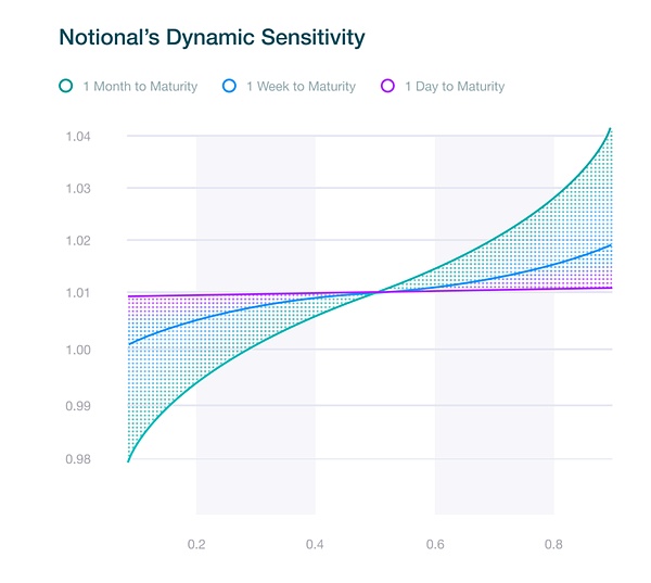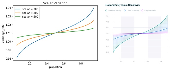 Notional 选择了 logit curve,通过控制 scaler 参数使曲线相对平坦,使得 Token 可以用集中流动性的方式进行交易,并且使 scaler 参数与 t 相关,随着临近 maturity,使得曲线更平坦、Token 交换汇率接近 1:1。