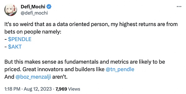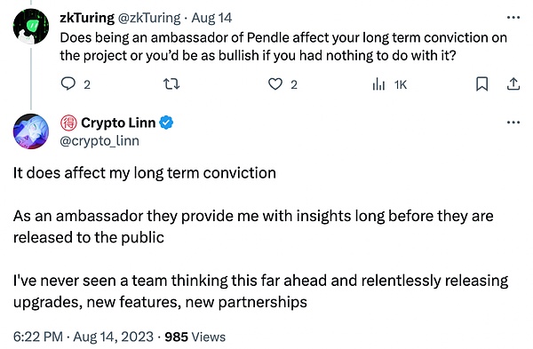 Twitter 作为触达 Web3 深度用户的主阵地,Pendle 自然没有错过。不过,虽然内容策略是每个 DeFi 协议的标配,Pendle 仍然在这块做出了自己的特色。Pendle 目前官宣的大使包括 @crypto_linn,@ViNc2453(中文区),@Neoo_Nav(越南)。难能可贵的是每位大使都对 Pendle 有深度认同,而不仅仅是简单恰饭 :) 以 crypto linn 为例,她曾多次在文中毫不掩饰表达其对 Pendle 及其团队的欣赏: