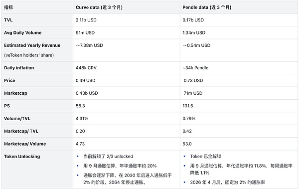 Curve 的 Volume/TVL 是 4.31% ,比 Pendle 的情况好很多;每日支出 448K CRV,日收入约为 $20k,显然 Curve 也没能做到收支平衡。不过对比两者 PS,当前 Pendle 131.5,Curve 为 58.3,除了 PS 外,更适合 DeFi 项目的指标有 Marketcap/TVL 与 Marketcap/Volume,Pendle 分别是 0.42 与 53.0,Curve 分别是 0.20 与 4.73,高倍率一定程度代表市场对 Pendle 未来高增速的预期。这也很符合 Crypto 市场的特点,我们鼓励创造 Pattern 的人,创新项目值得更高的估值 :)