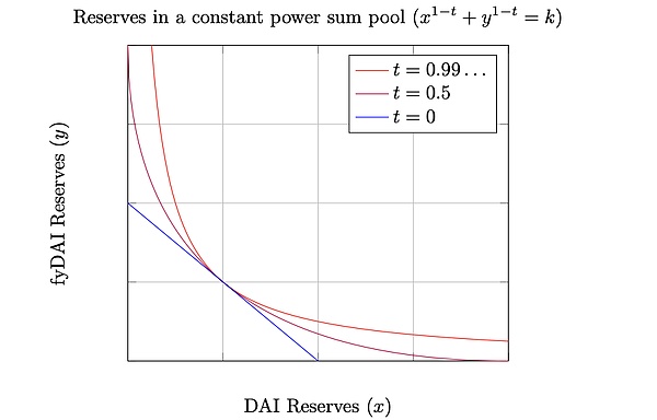 随着 t 接近 0,曲线接近 x+y=k 的曲线,符合了零息债券 maturity 后与底层资产汇率 1:1 的特点