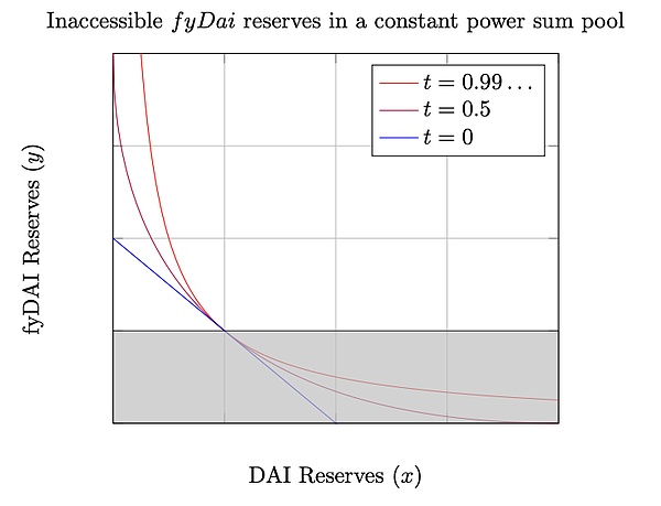 收益率不可能为负数,所以曲线中实际上有一半的流动性是被浪费掉的,交易不会真正在这一半曲线上发生。所以 Yield Protocol 会虚拟出这段曲线所需 Token,而不需要 LP 提供。虚拟的 Token 仍参与每次交易的运算,使得在使用原始公式的基础上,LP 的资金不被无谓占用。