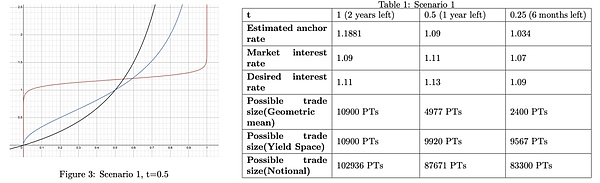 至于如何保证利率连续,Notional 选择每次交易前更新 logit curve 的 anchor 参数,使利率锚定在合理值,避免产生套利空间。重锚后,再根据当时的 scaler 进行交易。