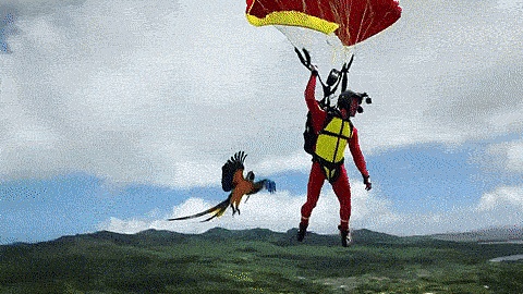a man BASE jumping over tropical hawaii waters. His pet macaw flies alongside him