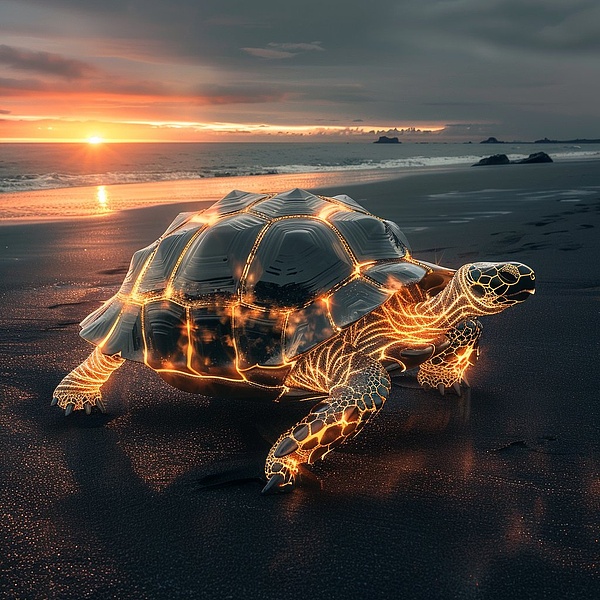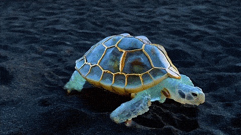 下面是一只玻璃乌龟,裂缝用金繕工艺修复,在日落时分走在黑色的沙滩上。