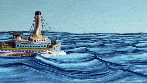 in a beautifully rendered papercraft world, a steamboat travels across a vast ocean with wispy clouds in the sky. vast grassy hills lie in the distant background, and some sealife is visible near the papercraft ocean's surface