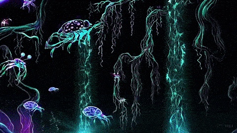 黑暗的霓虹灯雨林里,闪耀着奇幻的动植物。