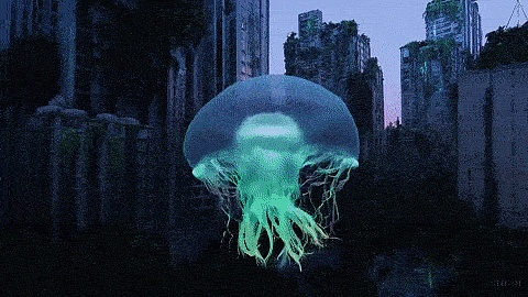 黄昏时分,一只巨大的半透明水母优雅地飘浮在荒芜的城市中,还是用35毫米胶片拍摄的超现实场景。