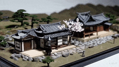 这是一个精心制作的立体模型:江户时代,木结构建筑前,一个孤独的武士慢慢穿过小镇。