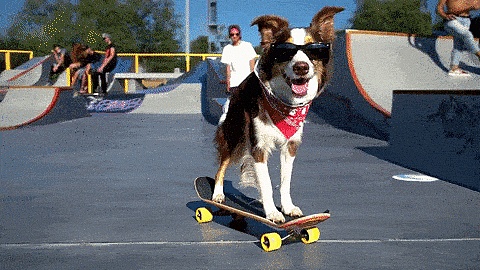 a brown and white border collie stands on a skateboard, wearing sunglasses
