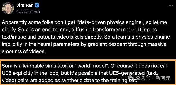 英伟达高级科学家Jim Fan同样表示,「如果Sora接受过大量UE5合成数据的训练,我不会感到惊讶的!」