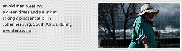 这样我们就可以看到——a穿着b样子的衣服,在c地点的d天气下,惬意地散步。