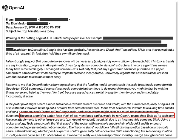 而在这之后,马斯克建议将OpenAI并入特斯拉。“2018年2月初,埃隆给我们转发了一封电子邮件,建议OpenAI应该‘把特斯拉当作它的摇钱树’,并评论说,‘完全正确……特斯拉是唯一一条有希望与谷歌匹敌的道路。’即便如此,与谷歌抗衡的可能性也很小,但至少不是零了。”