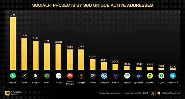 目前,UXLink 已经取得完成了2024年的1000 万注册用户指标,现用户1500万,并且有500 多万的链上积分持有者和160 多万NFT 持有者。链上月活超 1M,排名 DappRadar 链上活跃应用第一。截止今年6月的30日,UXLINK的活跃独立地址数位列于socialfi赛道首位,并与第二名拉出绝对差距。