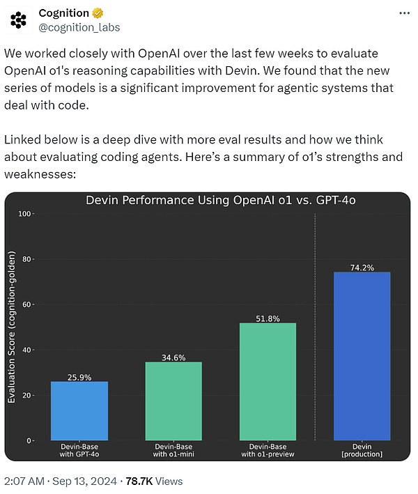 开发出首个 AI 软件工程师 Devin 的 Cognition AI 表示,过去几周一直与 OpenAI 密切合作,使用 Devin 评估 o1 的推理能力。结果发现, 与 GPT-4o 相比,o1 系列模型对于处理代码的智能体系统来说是一个重大进步。