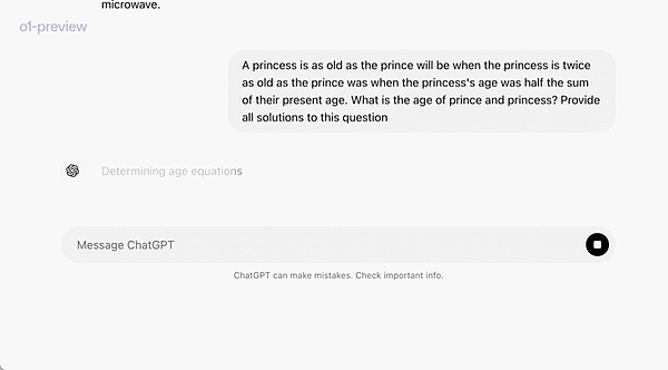 在一个官方演示中,o1-preview 解答了一个非常困难的推理问题:当公主的年龄是王子的两倍时,公主的年龄与王子一样大,而公主的年龄是他们现在年龄总和的一半。王子和公主的年龄是多少?提供这个问题的所有解。
