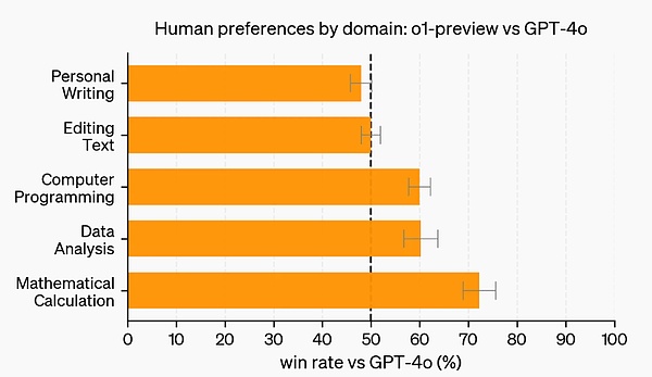 除了考试和学术基准之外,OpenAI 还在更多领域的具有挑战性的开放式提示上评估了人类对 o1-preview 和 GPT-4o 的偏好。