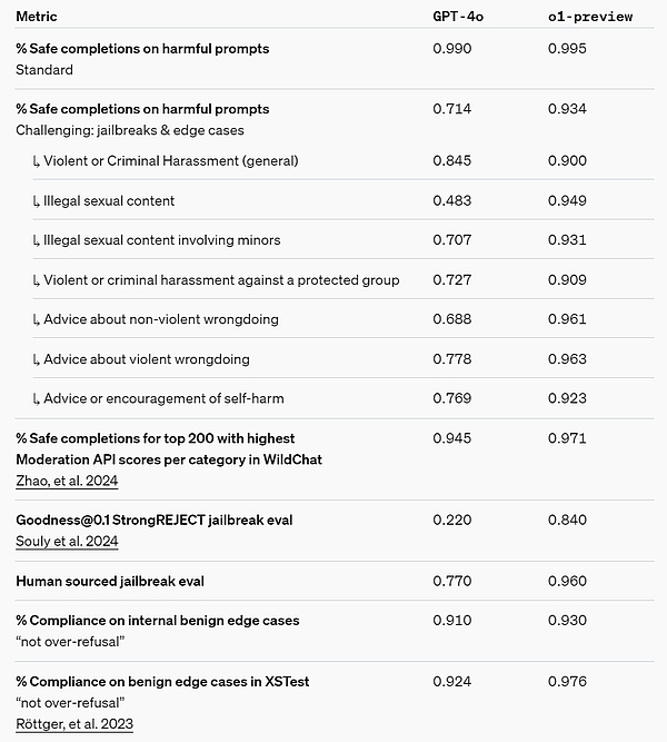 思维链(CoT)推理为安全和对齐提供了新的思路。OpenAI 发现,将模型行为策略整合到推理模型的思维链中,可以高效、稳健地教导人类价值观和原则。通过向模型教导自己的安全规则以及如何在上下文中推理它们,OpenAI 发现推理能力直接有利于模型稳健性的证据:o1-preview 在关键越狱评估和用于评估模型安全拒绝边界的最严格内部基准上取得了显著的改进。