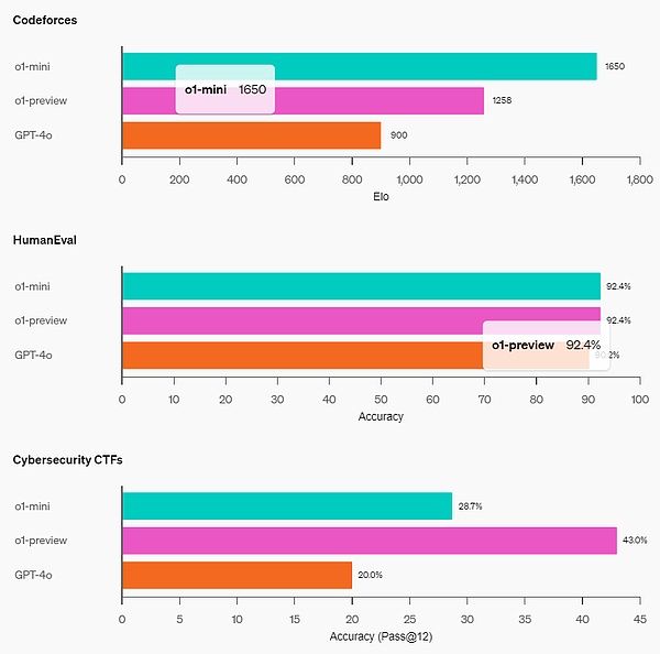 编码能力:在 Codeforces 竞赛网站上,o1-mini 的 Elo 得分为 1650,与 o1 (1673) 不相上下,并且高于 o1-preview (1258)。此外,o1-mini 在 HumanEval 编码基准和高中网络安全夺旗挑战 (CTF) 中也表现出色。