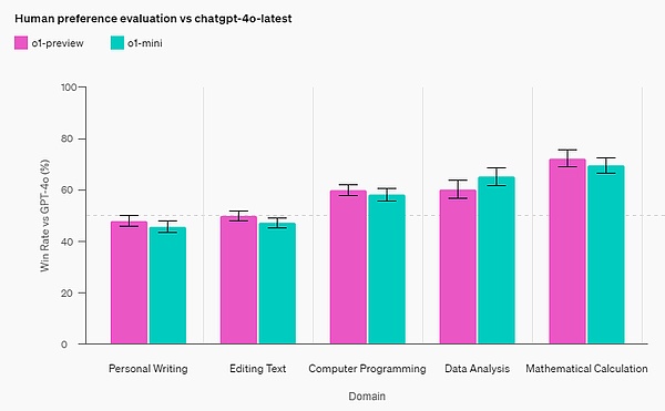 人类偏好评估:OpenAI 让人类评分员在各个领域具有挑战性的开放式提示上比较 o1-mini 和 GPT-4o。与 o1-preview 类似,在推理密集型领域,o1-mini 比 GPT-4o 更受欢迎;但在以语言为中心的领域,o1-mini 并不比 GPT-4o 更受欢迎。