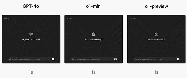 在速度层面,OpenAI 比较了 GPT-4o、o1-mini 和 o1-preview 对一个单词推理问题的回答。结果显示,GPT-4o 回答不正确,而 o1-mini 和 o1-preview 均回答正确,并且 o1-mini 得出答案的速度快了大约 3-5 倍。