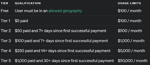 至于通过 API 访问的用户,OpenAI 表示达到了 5 级 API 使用量的开发者可以即刻开始使用这两个模型开始开发应用原型,但同样也被限了速:20 RPM。什么是 5 级 API 使用量?简单来说,就是已经消费了 1000 美元以上并且已经是超过 1 个月的付费用户。请看下图: