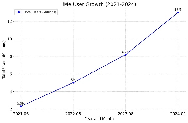 2021年6月,iMe的用户为230万,日活跃用户超过20万,截止2024年9月 目前iME已经拥有1300万的用户。3年用户增长率达到565%左右。由于iME账户和Telegram账户完全通用,TG的9亿用户也可随时无缝的使用iMe版本的TG软件。