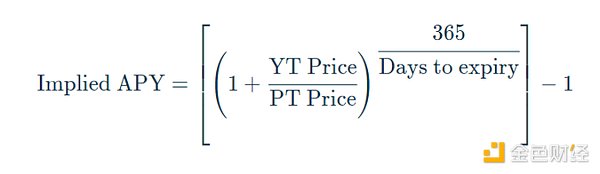 Implied APY:是市场对该资产未来 APY 的共识,反映在 YT 和 PT 资产的价格上,其计算公式为: