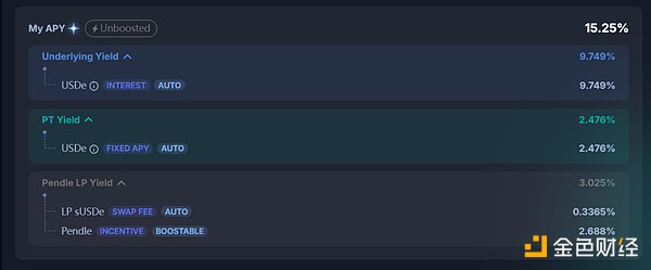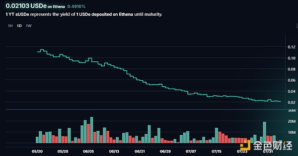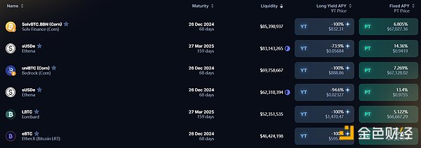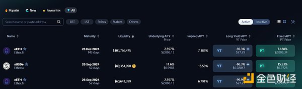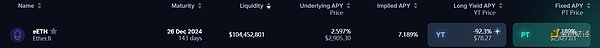 Long Yield APY:专门针对 YT 资产,在当前价格购买 YT 的年收益率,但这一收益率是不断在变化的,因为生息资产本身的收益率在变化(这个值有可能是负数,即当前的 YT 价格过高,导致超过了项目的未来收益)。值得注意的是,目前 Pendle 许多 YT 资产的潜在收益为空投和积分,价值无法估算,因此许多 YT 资产的 Long Yield APY 为 -100%。