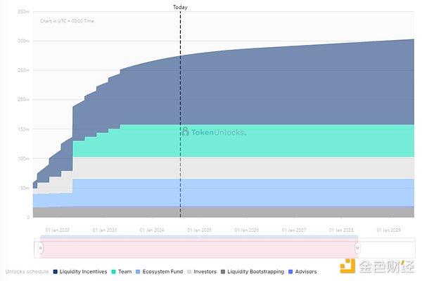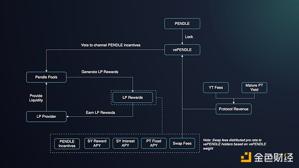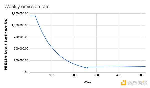 这四个收益率在 Pendle Market 的界面都会同时给出,当 Underlying APY>Implied APY 时,说明持有该资产的收益将大于持有 PT 的收益,此时可以采用做多收益率的策略,即买入 YT、卖出 PT,当 Underlying APY Pendle AMM 用来实现 SY、PT 和 YT 代币之间的交易。根据 Pendle 白皮书,在 V2 版本中,Pendle 改进了 AMM 机制,借鉴了 Notonial Finance 的 AMM 模型,提高了资金效率,降低了滑点。市面上固收类协议的三种 AMM 模型的图示如下,其中 X 轴是指 PT 资产在池子中的比例,纵轴为 Implied Interest Rate,目前 Pendle 采用的是红色曲线对应的 AMM 模型,黑色曲线为 V1 模型,蓝色曲线为其他固收类协议的 AMM 模型。 在具体的池子中,Pendle V2 采用了 PT-SY 的交易对,例如 PT-stETH 和 SY-stETH,可以大大降低 LP 的无常损失(后面会进行详细分析)。由于 SY=PT+YT,因此可以通过 Flash Swap 的方式实现 YT 的兑换,具体的流程如下。如用户需要购买价值 1ETH 的 YT-stETH,即需要实现 ETH 到 YT-stETH 的兑换。假设 1ETH=N YT-stETH,合约将从池子中借出 N-1 个 SY-stETH,并将用户的 ETH 转化为 SY-stETH(具体的过程是,先将 ETH 通过 Kyberswap 兑换成 stETH,然后在协议内封装为 SY-stETH),然后将所有的 SY-stETH(N 个)拆分为 PT 和 YT,把适当数量的(在本例中为 N)YT 给用户,然后将 PT(N 个)归还给池子,在池子中实际完成的是 SY-PT(N-1 个 SY 兑换成了 N 个 PT)的兑换。 卖出 YT 的流程则相反。如果用户想要卖出 N 个 YT(假设 N 个 YT 此时的价值为 1 个 SY),合约将从池子中借出 N 个 PT,将其合并为 N 个 SY,并将一个 SY 给用户,N-1 个 SY 归还给池子,此时在池子中实际完成的是 PT-SY 的(N 个 PT 被兑换成了 N-1 个 SY)兑换。 和其他的 AMM 一样,Pendle AMM 同样需要 LP 为池子提供流动性,但由于在到期日,一个 PT 一定等于一个 SY,因此在到期日的时候,LP 不存在无常损失。用户在提供流动性时,提供的资产为 SY 和 PT 资产,因此将自动捕获这部分资产的原生收益,此外还包括交易费和 PENDLE 的流动性挖矿奖励,即包括四项收益来源: PT fixed yield:购买 PT 本身的收益 Underlying yield:即 SY 资产的收益 Swap fees:交易费的 20% PENDLE 代币激励 PENDLE 的代币经济机制主要在于锁仓获取 vePENDLE 后,所能参与的协议分成和决策治理。类似于 Curve 的 veCRV 模型,用户可以将 PENDLE 进行锁仓以换取 vePENDLE,锁仓时间越长,获得的 vePENDLE 的数量越多,锁仓时间从 1 周到 2 年不等。 持有 vePENDLE 的好处包括: Boost 收益:可以对自己作为 LP 的收益进行 Boost,最高额度为 2.5 倍 投票权:对 PENDLE 激励在不同池子中的分配进行投票 收益分成:vePENDLE 的持有者可以获得以下收益: 所投票池子内 80% 的交易费分成:vePENDLE 持有者对 PENDLE 激励的流向进行投票,只有完成投票才能获得所选交易池的奖励 所有 YT 收益的 3% 一部分 PT 的收益:这部分来源于未赎回的 PT,例如⼀个用户购买了 PT 资产,到期时没有赎回,经过⼀段时间后这部分资产被协议获取 在收益率的计算上,持有 vePENDLE 的 Total APY=Base APY+Voter’s APY,其中 Base APY 来自 YT 和 PT 的收益,Voter’s APY 来源于指定池子的交易费分成,也是构成 APY 的主要部分——目前 Base APY 仅为 2% 左右,而 Voter’s APY 可高达 30% 及以上。 Pendle 的 ve 模型同样促进了贿选平台的诞生,Penpie 和 Equilibria 都在从事相关的业务,类似于 Convex 与 Curve 之间的业务过程。但相比于 Curve,在 Pendle 上所交易资产的核心项目方并没有贿选的需求,Curve 作为稳定币和其他锚定资产的主要交易平台,保证池子的深度对维持币价的锚定具有重要意义,这促使项目方有极大的需求来参与贿选引导流动性,但保持 Pendle AMM 的交易深度似乎对 LSD 和 LRT 等相关项目方来说没有太多意义,因此参与贿选的主要动力将来源于 Pendle 上的 LP。贿选平台的建立主要优化了两方面的问题:1)Pendle LP 可以不用购买和锁定 PENDLE 来获得更高的收益;2)PENDLE 的持有者可以获得具有流动性的 ePEDNLE/mPENDLE,以获得 vePENDLE 的激励。由于本文仅对 Pendle 进行分析,因此在此处不对贿选生态进行过多展开。 PENDLE 代币于 2021 年 4 月推出,采用混合通胀模型,代币供应无上限,在前 26 周内提供每周 120 万个 PENDLE 的稳定激励,之后(27 周 -260 周),流动性激励将每周衰减 1%,直到第 260 周,此后(261 周以后),通胀率为每年 2%,用于激励。 根据 Token Unlock 数据,初始代币分配给予团队、生态系统、投资者、顾问等,目前全部代币已经完成解锁,如果不考虑 OTC 交易,仅考虑初始分配,PENDLE 未来不会面临大额集中解锁。目前每日通胀仅来自于流动性挖矿激励,每日排放数量约为 34.1k 的 PEDNLE,根据 8 月 5 日币价($2),每日解锁抛压为 $68.2k,抛压比较小。 Pendle 的发展大致可分为三个阶段: Pendle 成立于 2021 年,彼时虽然正值 DeFi Summer,但 DeFi 处于基建期,主要项目围绕着 DEX、稳定币和借贷三大件进行,作为利率交换产品并未得到太多的关注。 直到 2022 年末,随着以太坊完成向 PoS 的转变,以太坊质押利率成为了币圈的原生利率,一众 LSD 资产快速涌现,这造成:(1)利率成为了币圈的关注重点之一;(2)大量生息资产诞生,Pendle 找到了自己的 PMF;(3)Pendle 成为炒作 LSD 赛道的小市值标的,且细分赛道内竞品较少。这一时期上线 Binance 进一步提高了 Pendle 的估值上限。 2023 年末至 2024 年初,Eigenlayer 开启以太坊的再质押叙事,一众流动性再质押(LRT)项目纷纷诞生,Eigenlayer 和 LRT 项目均宣布了积分和空投计划,积分大战一触即发
