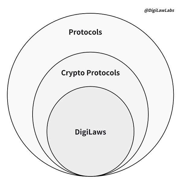 5. 协议(各种条约、合同、规则)>加密协议(区块链协议与智能合约协议)>DigiLaw(仅去中心且代币化的加密协议)。