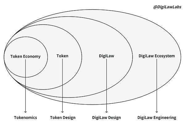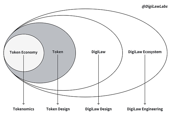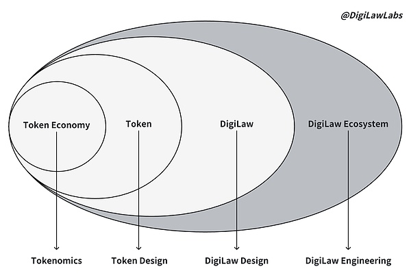 这类“活系统”的设计与演进是一个全新的世界级的挑战。仅代币经济的设计就覆盖了逆向博弈、激励相容等诺奖级难题,更何况这类问题的解决应该上升到代币设计、DigiLaw 设计,乃至整个 DigiLaw 生态系统的设计上来(关系如上图)。从某些维度上讲,其难度不亚于先进的芯片设计、火箭和飞机设计、汽车设计、摩天大楼的设计等,所以不能只依赖诞生于这类“死”系统的“Model-Based System Engineering(MBSE)”方法,需要进一步升级至适用于存在涌现现象的活系统的“Agent-Based System Engineering(ABSE)”方法,来对 DigiLaw 生态系统全生命周期各个层次的行为进行理解、设计与建模仿真。除了设计上的难题,这类“活”系统的演进面临着更大的挑战。如何实现人工治理最小化?是否能构建出一套完善的自我调节体系,可以根据外部环境的变化和内部运行状况进行动态的参数和机制调整?甚至未来是否能借助强大的 AI 来实现“活”系统的自适应?