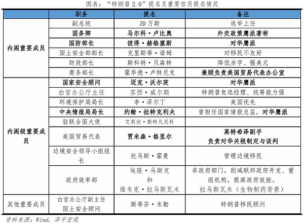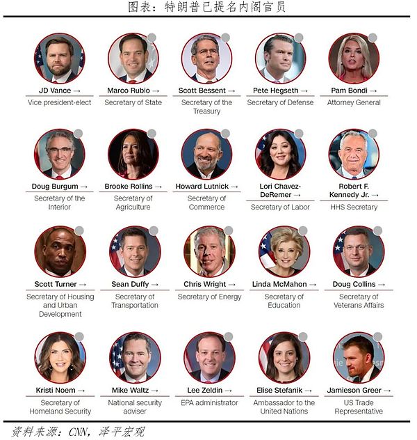 11月6日,特朗普宣布赢得大选,并启动“特朗普2.0”内阁成员和重要官员提名工作。截至11月23日,外交、国防、司法、内政等领域团队雏形基本形成。