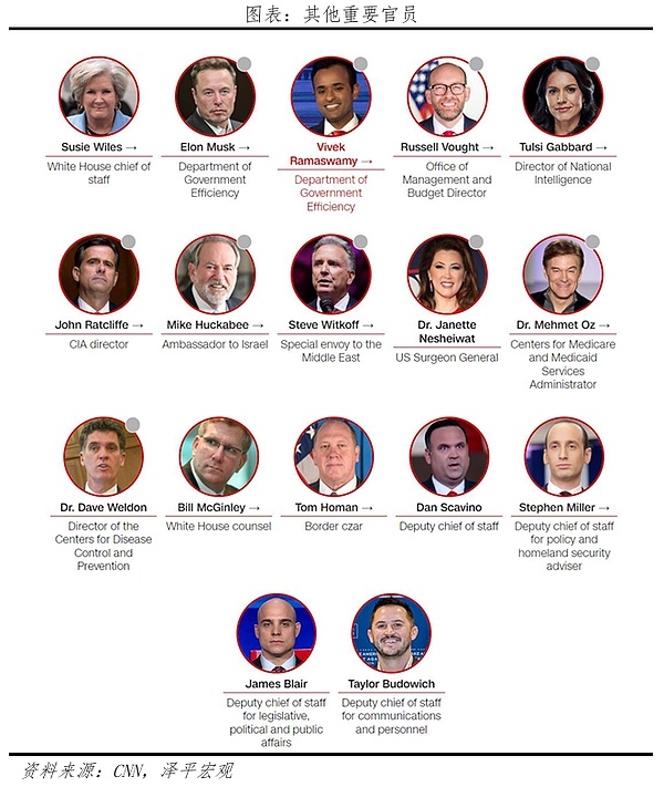 3)白宫办公厅主任(幕僚长)候选人苏西·威尔斯,深受特朗普信任,将是美国历史上第一位被任命为白宫办公厅主任的女性,沟通和管理经验相对丰富,但政治经验不足。