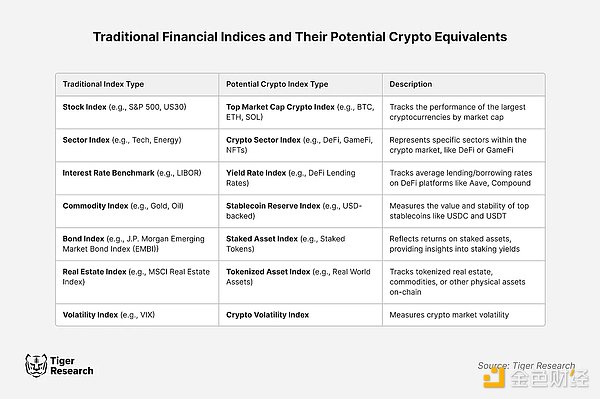 传统金融市场长期以来一直依赖标准普尔 500 指数和道琼斯指数等基准来为定价、绩效跟踪和投资组合管理提供一致性和可信度。大宗商品市场同样使用指数来稳定原油和黄金等商品的价格。加密货币指数可以采用这种经过验证的模型,为机构投资者提供值得信赖的资产配置、绩效衡量和投资组合再平衡框架。