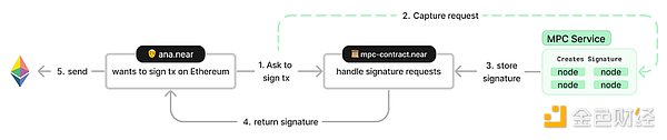 2. 以账户为中心:类似于 NEAR,构建一个全链的账户钱包,通过一个称为「链签名」的技术支持跨多种区块链协议签署和执行交易。其中核心组件是 MPC 网络,代替用户为多链交易签名。这套方案,虽然能极大的解决 UX 碎片化的问题,但是对于开发者来说,这涉及到复杂的后端实现,并且没有本质上解决流动性和状态分散。