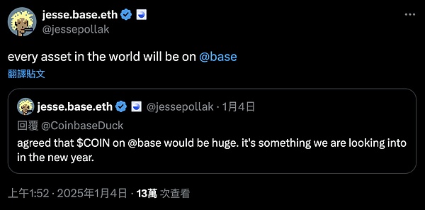 投资管理公司VanEck在预测2025年的加密市场时,曾大胆预期 Coinbase 会“采取史无前例的举措,对其股票进行代币化并部署到其 Base 区块链上”。预言似乎正走进现实:Base链的主要开发者 Jesse Pollak 日前透露,在Base链提供$Coin是“我们在新的一年正在研究的事情”,并期望“世界上的每种资产最终都会在Base上”。