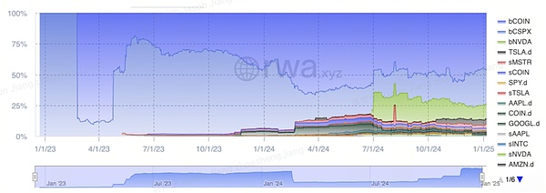 只是这次,主角不再只是加密货币,还有来自物理世界的诸多资产,例如股票。作为美国最大的加密货币交易所,Coinbase是现阶段代币化市场中最受欢迎的股票标的。rwa.xyz数据显示,截至2025年1月,代币化股票总市值约1255万美元,其中以Coinbase作为标的的代币化股票份额近5成。此外,美国科技股七巨头中的英伟达、特斯拉和苹果等股票代币也频繁出现在链上。