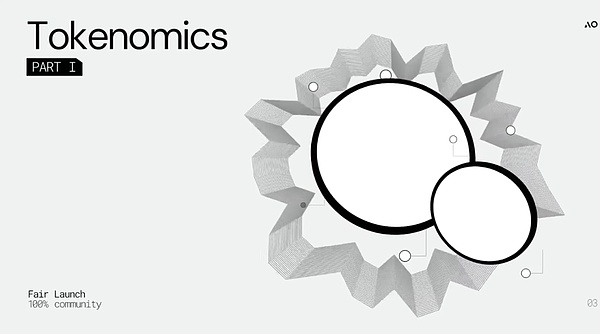 不过,今天你们来是为了了解代币经济学,那么我们就来谈一谈这一块。启动网络效应不仅需要技术进步,还需要正确的使用激励机制。这正是 AO 已经建立的独特货币系统的关键所在。让我们来看看它的设计。如我们之前所讨论的,AO 是完全公平发售的。这是一个建立在比特币伟大之上、强调平等准入和平等条款的激进新模型。
