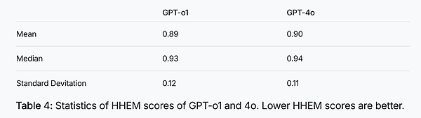 图:GPT-o1和4o的HHEM分数统计,HHEM分数越低幻觉越低