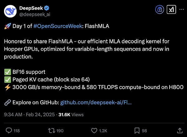它是为Hopper GPU开发的高效MLA解码内核,专门针对可变长度序列进行了优化,目前已经投入生产。