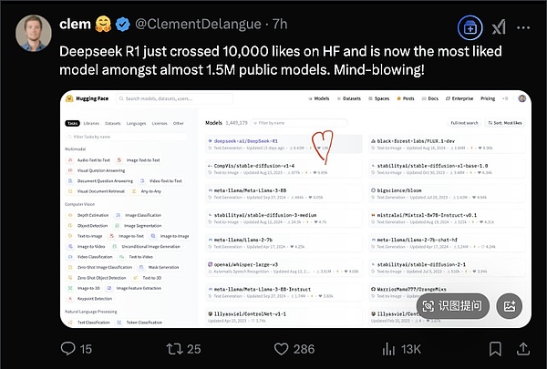 也就在今天,DeepSeek-R1 在HuggingFace上获得了超过10000个赞,成为该平台近150万个模型之中最受欢迎的大模型。