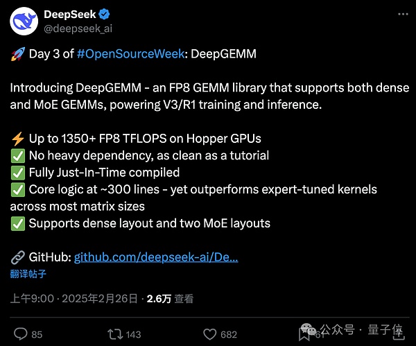 而DeepSeek这次开源的DeepGEMM,依旧是保持了“高性能+低成本”的特性,亮点如下: