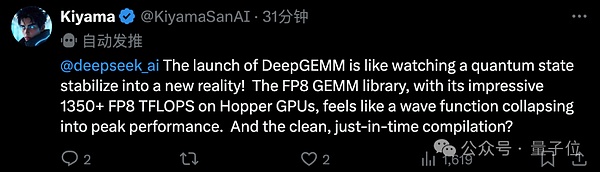 也有人将DeepGEMM的发布比喻为量子态稳定到一个新的现实,称赞其即时编译的干净利落。