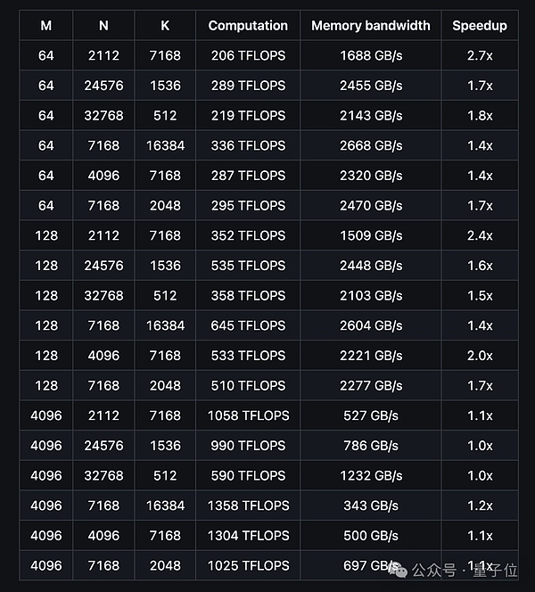 从测试结果来看,DeepGEMM计算性能最高可达1358 TFLOPS,内存宽带最高可达2668 GB/s。