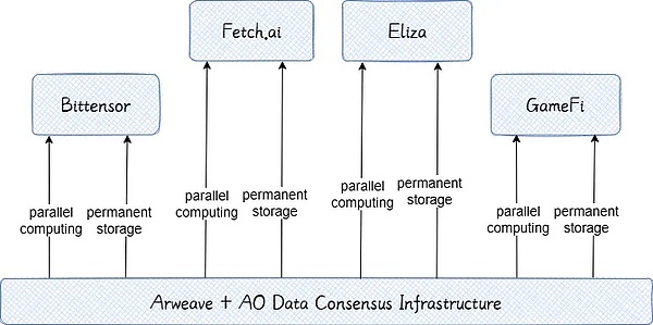 在去中心化 AI 领域,垂直项目如 Bittensor、Fetch.ai、Eliza 和 GameFi 等正在积极探索各自的应用场景。AO+Arweave 作为基础设施平台,其优势在于提供高效的分布式算力、永久数据存储和全链审计能力,能为这些垂直项目提供必要的基础支持。