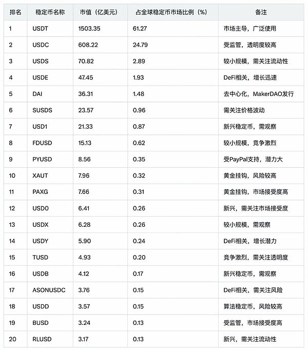 新兴稳定币:USD1通过机构背书(如Binance投资)快速扩张至21.33亿美元;USD0以DeFi激励机制吸引用户,市值达6.41亿美元。